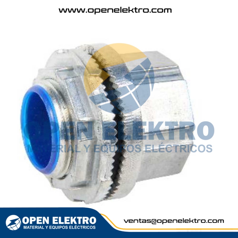 Conector recto de tuberías Rigid a cajas o envolventes con rosca. Fabricado en aleación zinc (ZAMAC), cuenta con garganta plástica para evitar daños en el cable al momento de realizar la instalación o montaje. Certificación: UL.